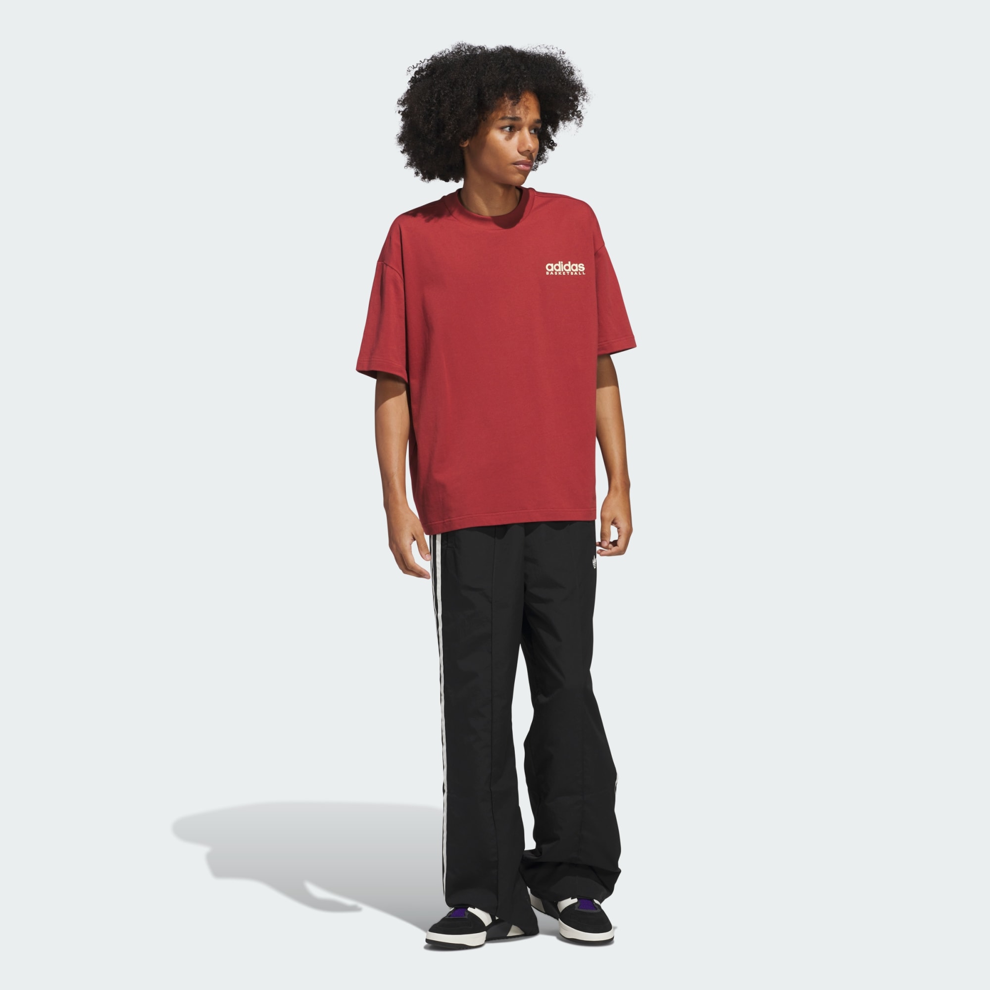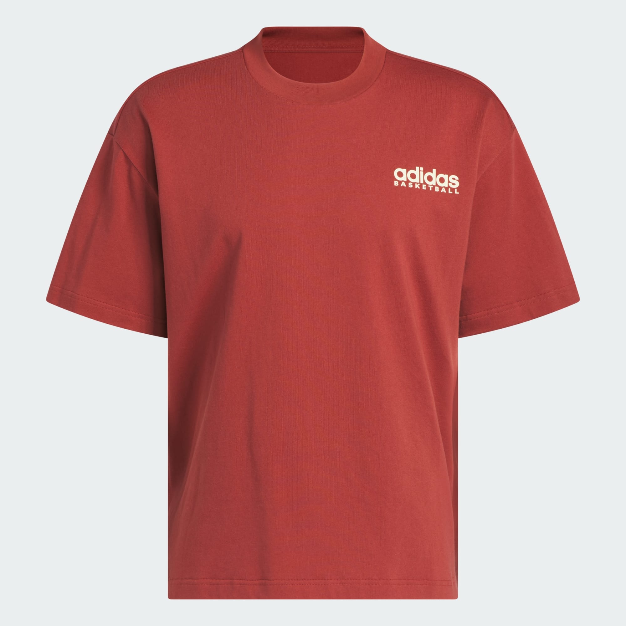 En løstsittende adidas-t-skjorte med retro basketballgrafikk på ryggen.