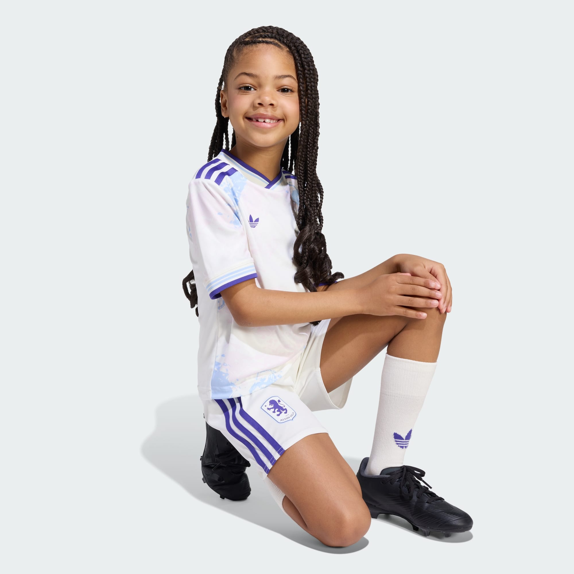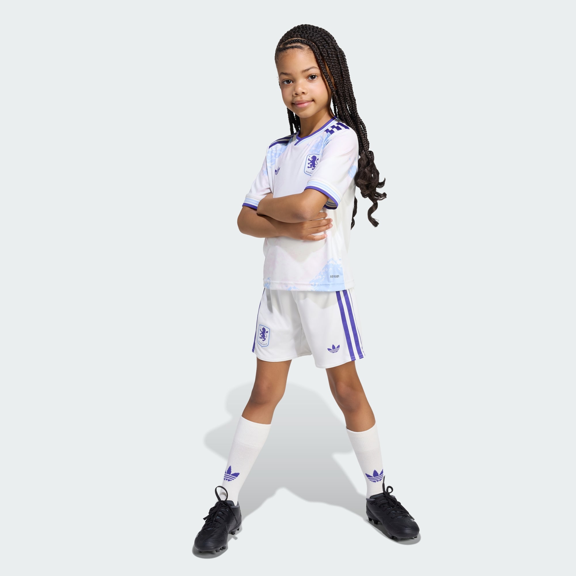 Dette tredjedrakt-settet til Aston Villa FC lages for barn, med iøynefallende trøye med design inspirert av Villa Parks berømte glassmalerier. Dette adidas-settet inkluderer også shorts og sokker, og holder den unge supporteren din komfortabel med myk børstet stoff og fuktighetsregulerende AEROREADY. Et par varmetrykte klubbemblemer og "AV"-signering på baksiden av trøyen viser frem at de stiller seg bak the Villans.