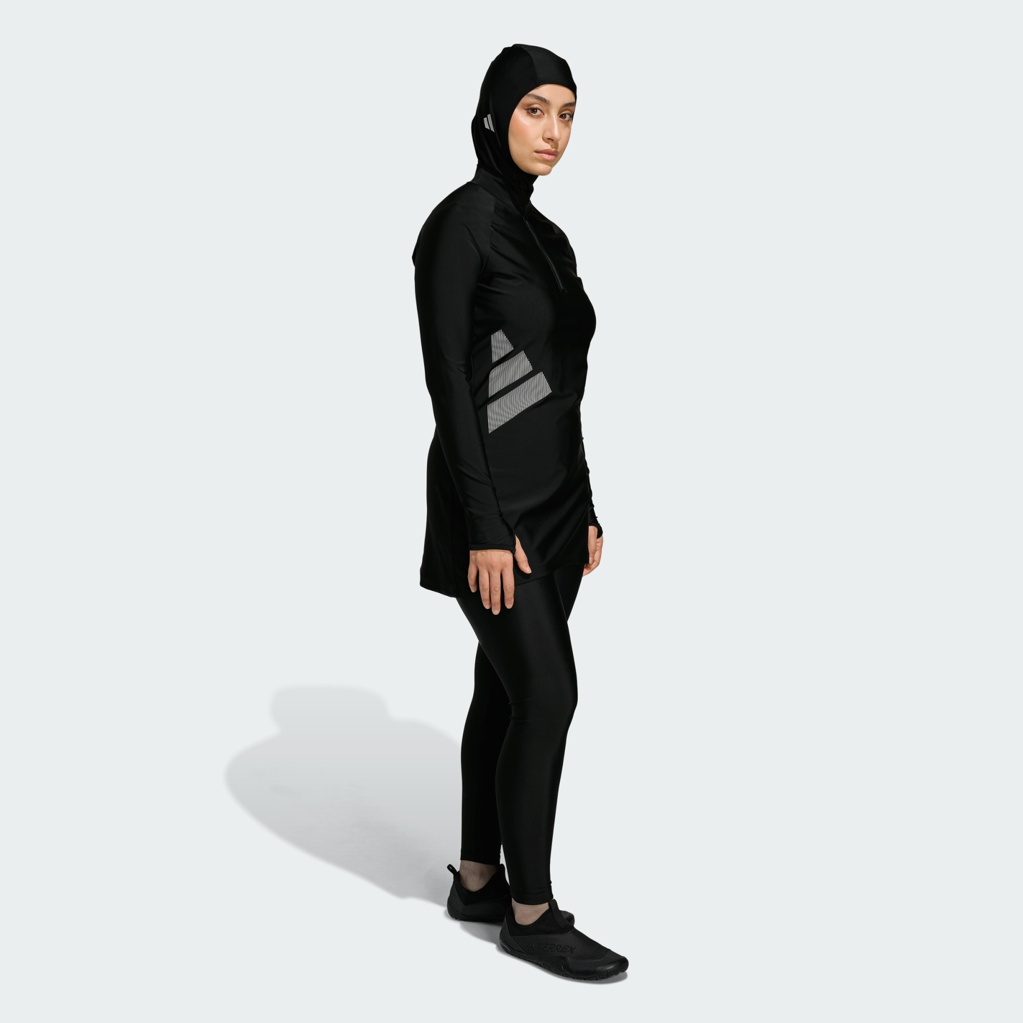 Stup ut i vannet med selvtillit i adidas Big Bars Long Sleeve-badetoppen. Den designes for bevegelse i og rundt vannet, og denne toppen kommer med en strømlinjeformet silhuett og allsidige dekningsalternativer, for frihet, fleksibilitet og selvtillit i aktiv svømming og vannsport. Infinitex-materialene lages for å motstå klor lenger og bevare levetiden til badetøyet ditt, enten det er for sporadisk eller regelmessig trening. Denne badetoppen lages med høy krage og glidelåsgarasje for dekning og komfort, og har glidelåsen foran for praktisk tilgang. Skjulte stropper nederst lar deg feste den til matchende badetights, mens tommelhullene holder ermene på plass under svømmeturen. Det store, teksturerte mønsteret på siden gir et sporty utseende, mens UPF 50+ UV-beskyttelse beskytter mot solens stråler.