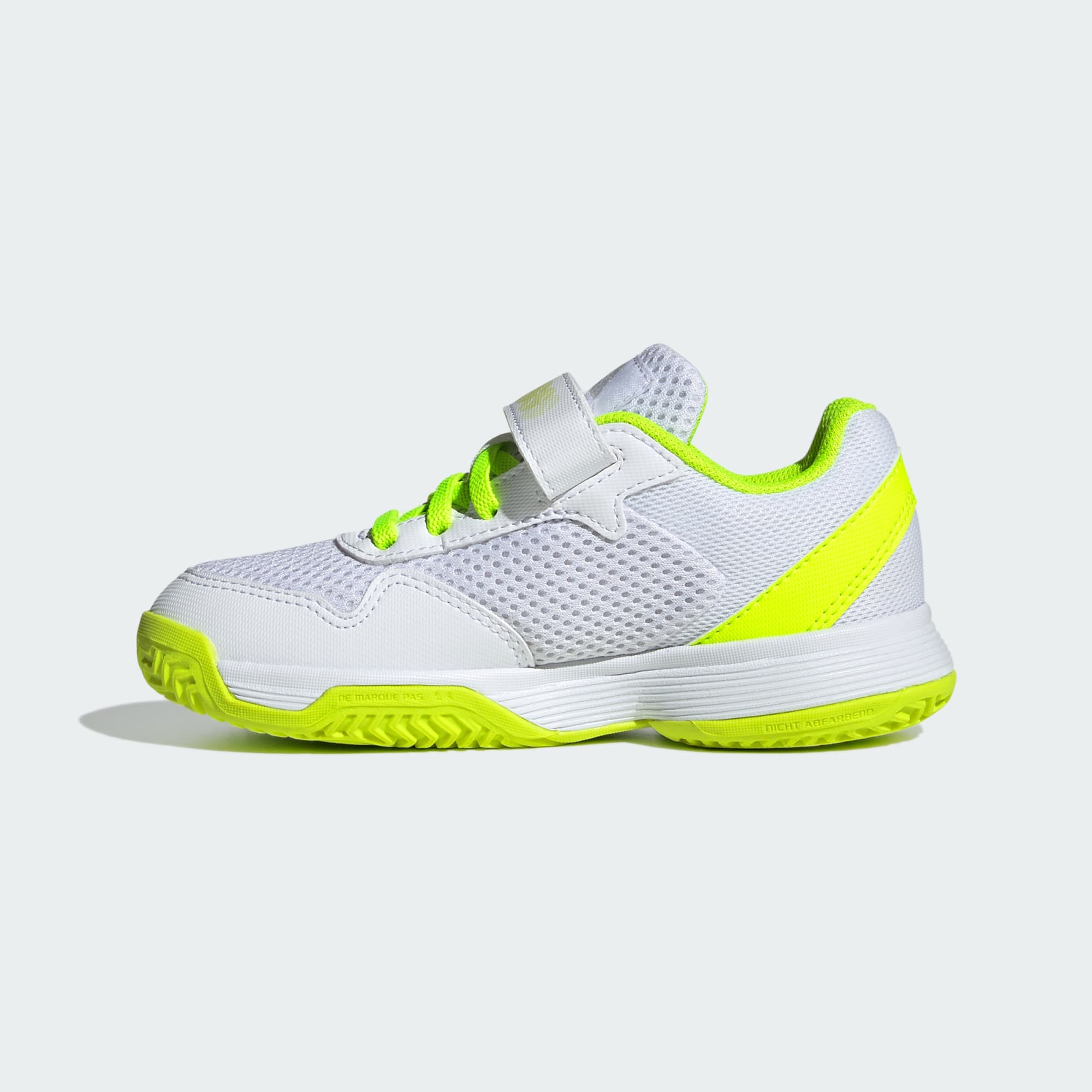 Når de vil øke tempoet, trenger tennisspillerne lette og støttende sko. Disse adidas Courtflash-skoene for barn har en overdel i luftig mesh, med lisser og borrelåsstropp som sikrer at unge spillere holder seg på plass i full hastighet. Den slitesterke Adiwear-yttersålen tåler kjappe manøvre og raskt fotarbeid på mange slags overflater.