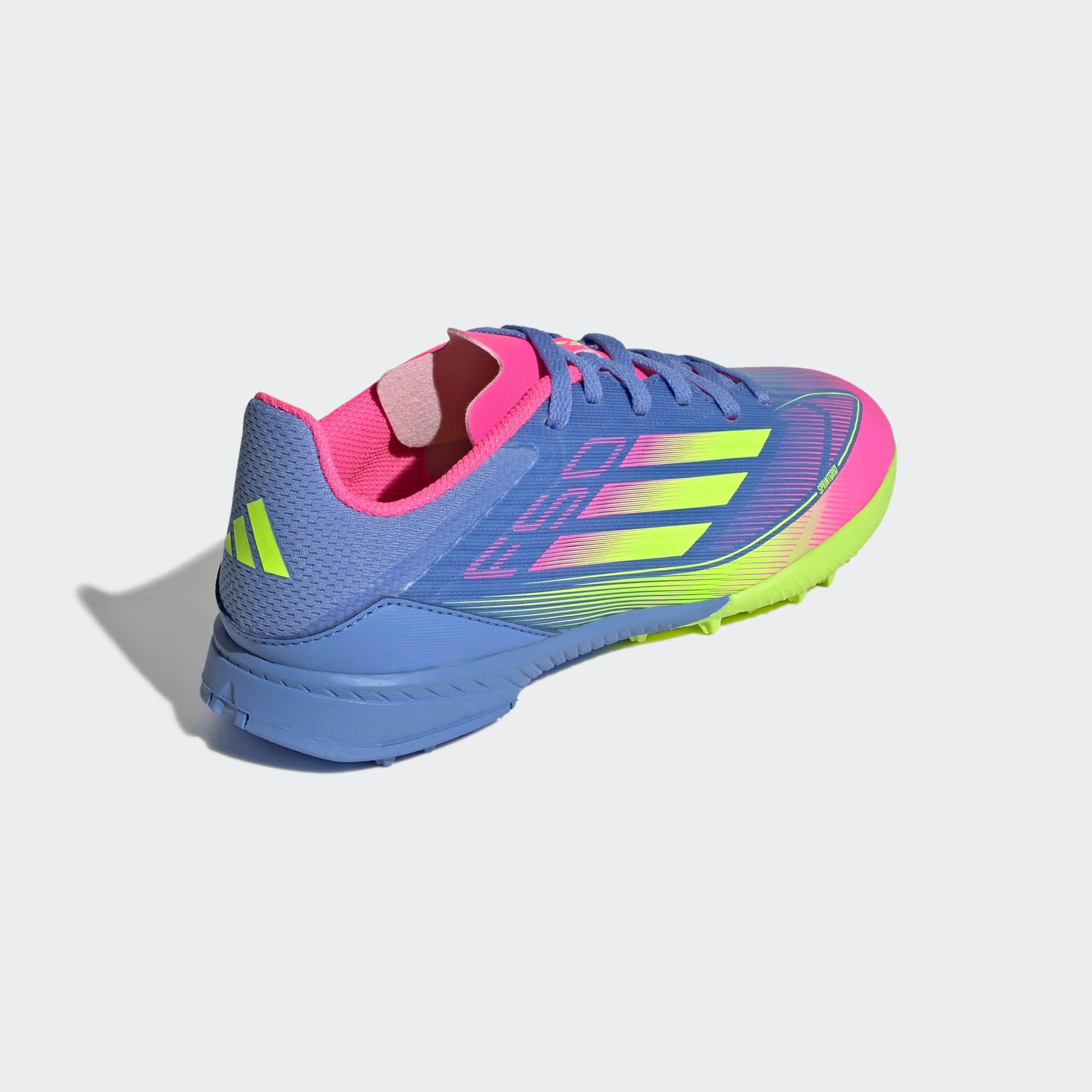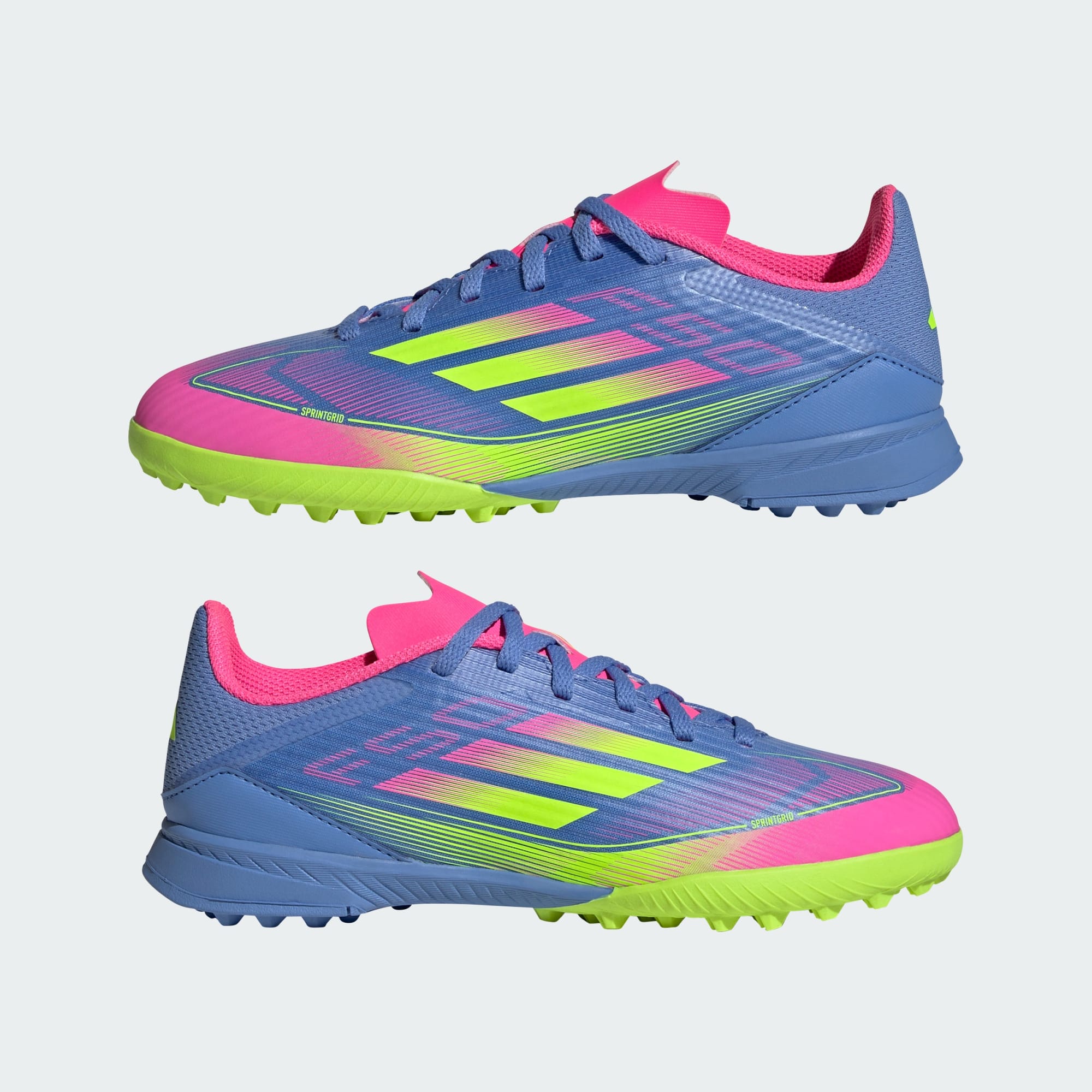 Press grensene i lette adidas F50-sko, laget for hurtighet. Disse adidas-fotballskoene for juniorer har iøynefallende Sprintgrid-grafikk, og Fiberskin-overdelen kommer med adaptiv Tunnel Tongue, som holder foten på plass. Myk EVA sitter på en gummi-yttersåle med knotter for kunstgress, og demper hvert steg.