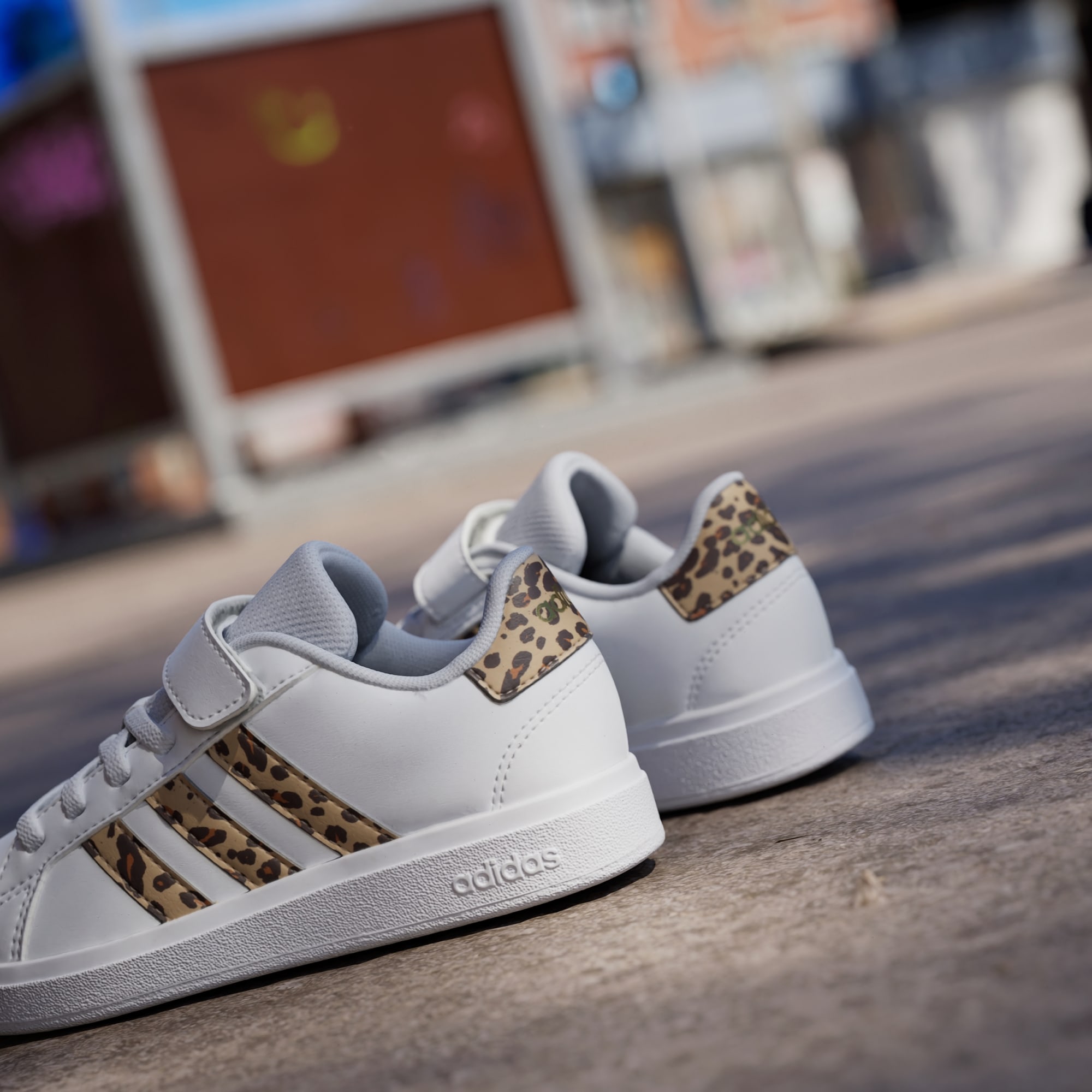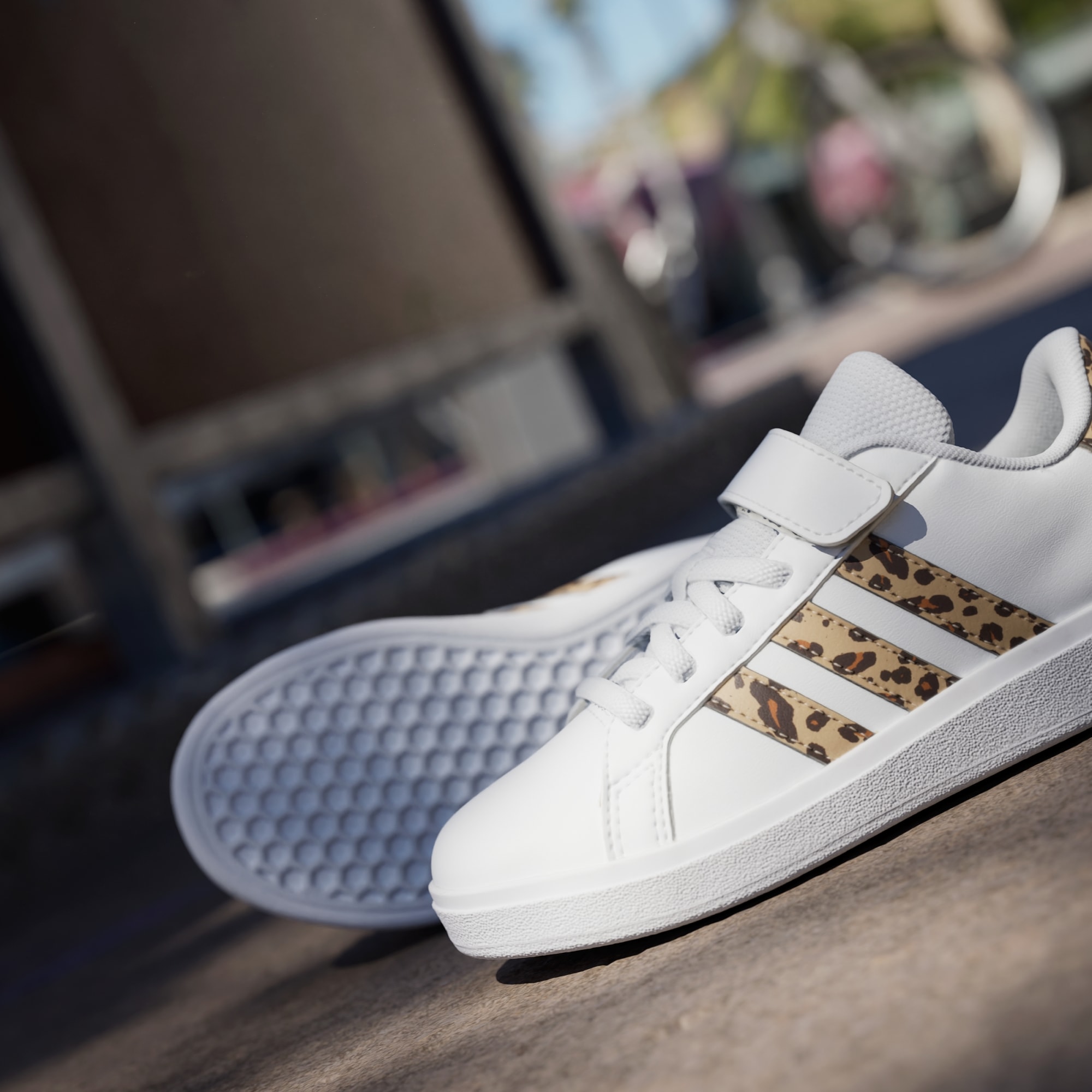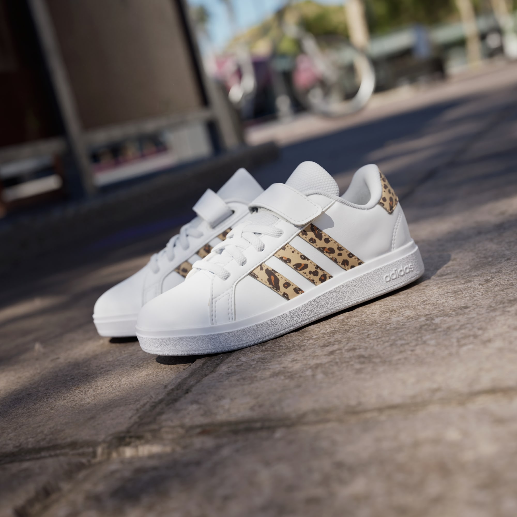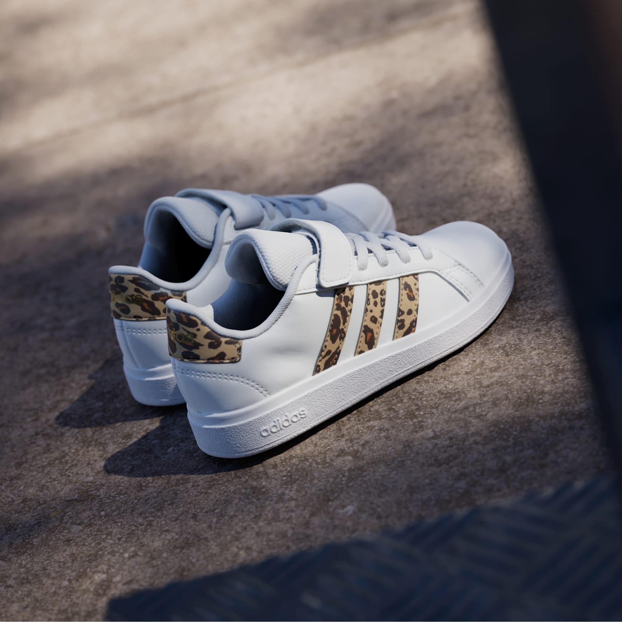 Detaljer med trykk gir et moderne preg til disse ikoniske Grand Courts. Disse adidas-sneakersene for barn er perfekte for de som alltid spretter mellom aktiviteter – og de er kjappe å ta på, med elastiske lisser og borrelåsstropp øverst som sikrer passformen. Det myke fôret støtter foten, og den fleksible koppsålen av gummi holder barna godt plantet. La moroa begynne.