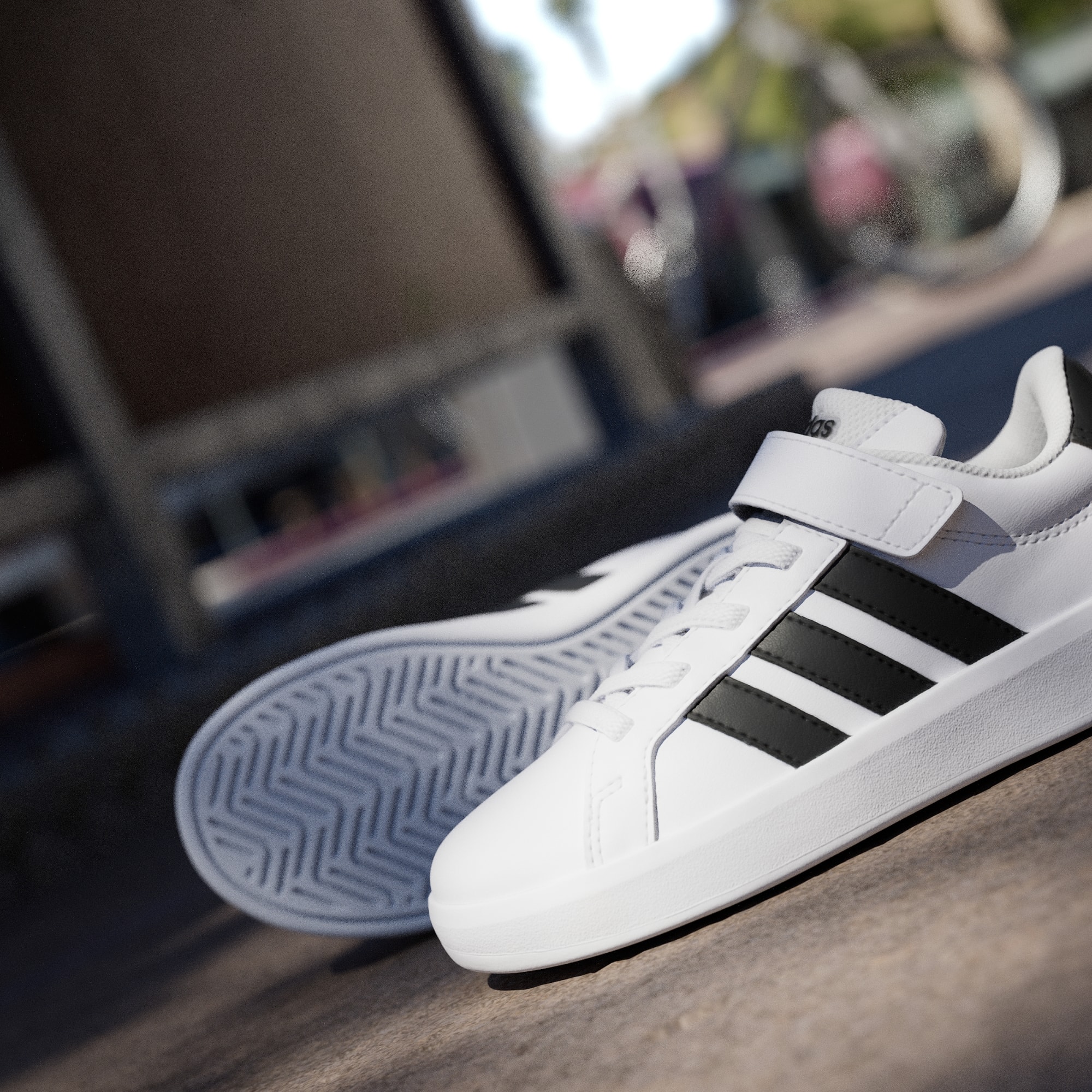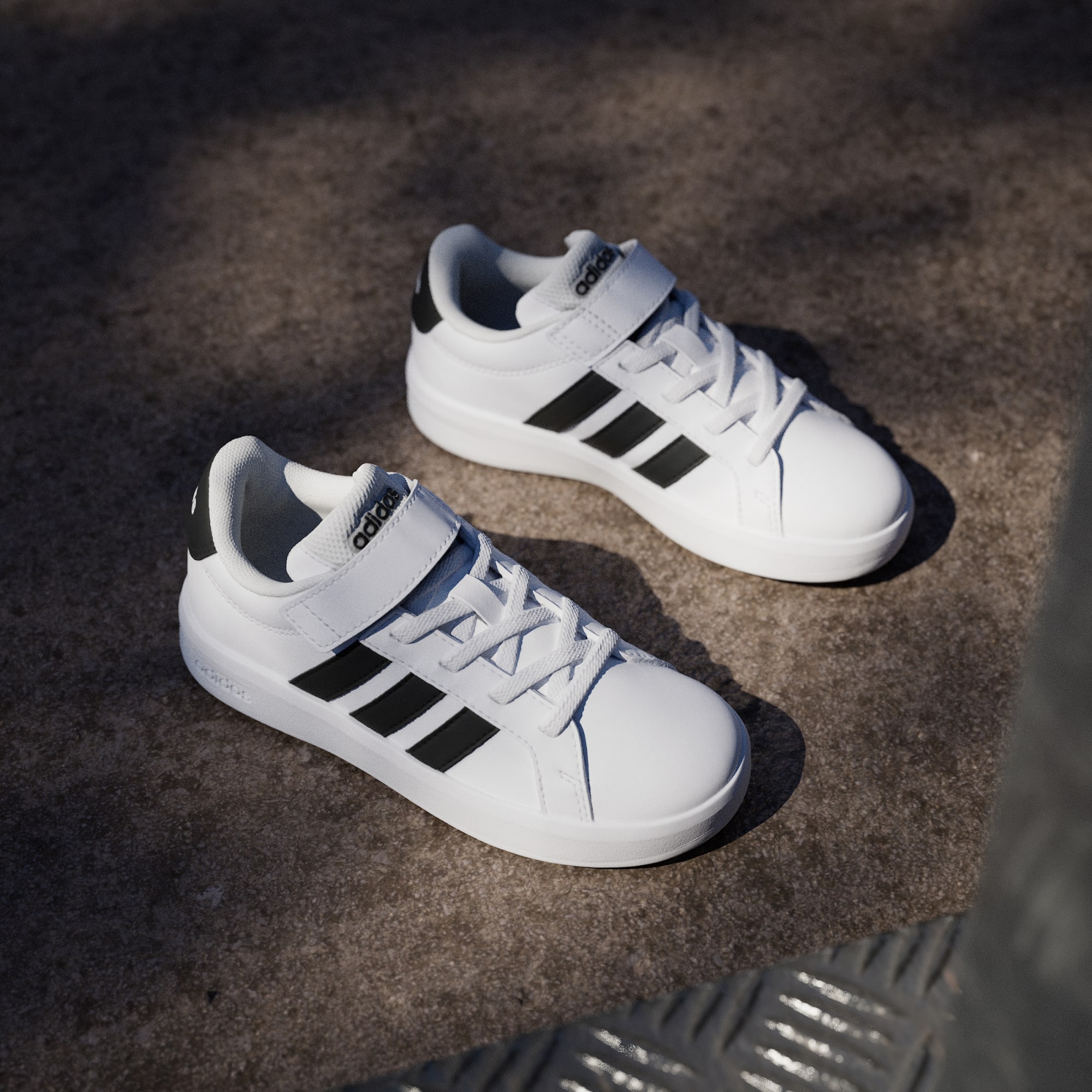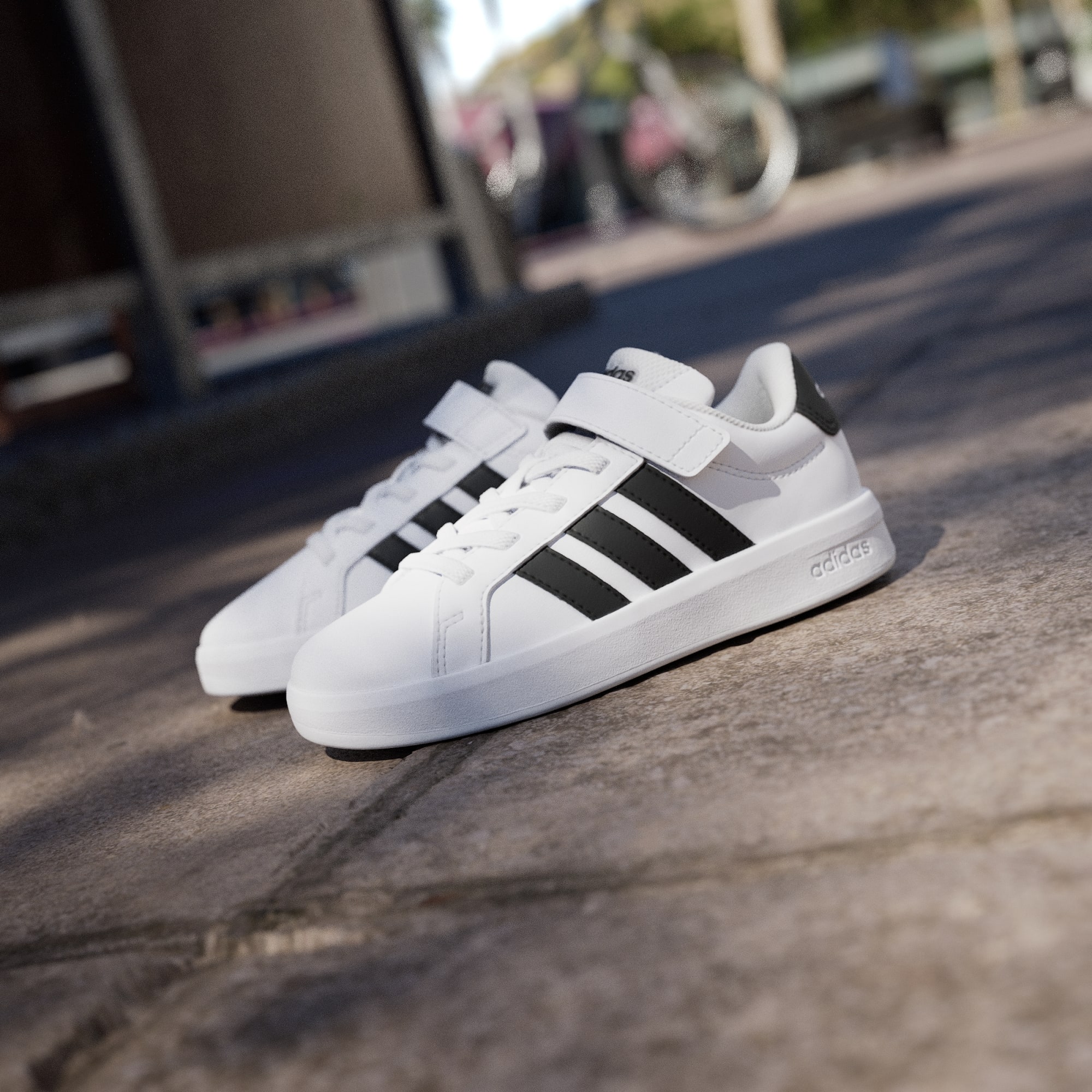 Disse skoene har med seg en moderne oppfriskning av ikoniske adidas Grand Court, og tilbyr oppgradert komfort med et design barna kommer til å elske. Leketiden forblir leken, og skoleturene går raskere takket være elastiske lisser som gjør disse enkle å ta av og på. Den fleksible forfoten gir fjæring til unge skritt, med en stropp øverst for å sikre en tettsittende og stabil passform. Foreldre setter pris på koppsålen av gummi som ikke sverter, utmerket for både grep og slitestyrke. Elegante men likevel solide – disse skoene prioriterer stil og funksjon. Signaturlogoen understreker det klassiske utseendet. Logoer på sålen, hælen og pløsen vil appellere til unge moteinteresserte, mens fargerike 3-Stripes minner oss om at disse skoene er ment for moro.