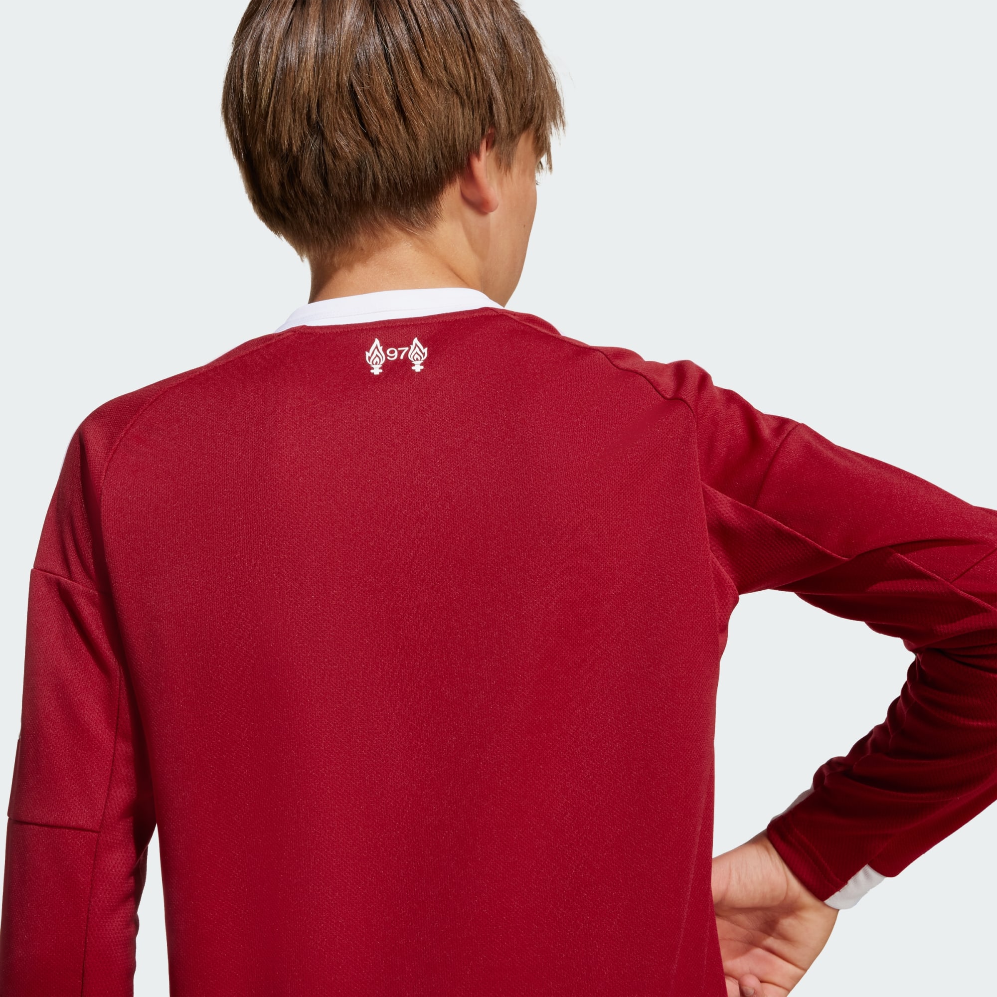 Velkommen hjem, Reds. Liverpool FC og adidas har alltid vært et perfekte team. Langermet hjemmetrøye for juniorer, laget med ekte fotballvibber fra midten av 2000-tallet, i et rent og skarpt uttrykk innrammet av hvite kantbånd. Gjennom drømmer og sanger – fuktkontrollerende AEROREADY holder supporterne komfortable, mens Liver Bird på brystet ikke kan unngå å fylle hjertet ditt med håp.