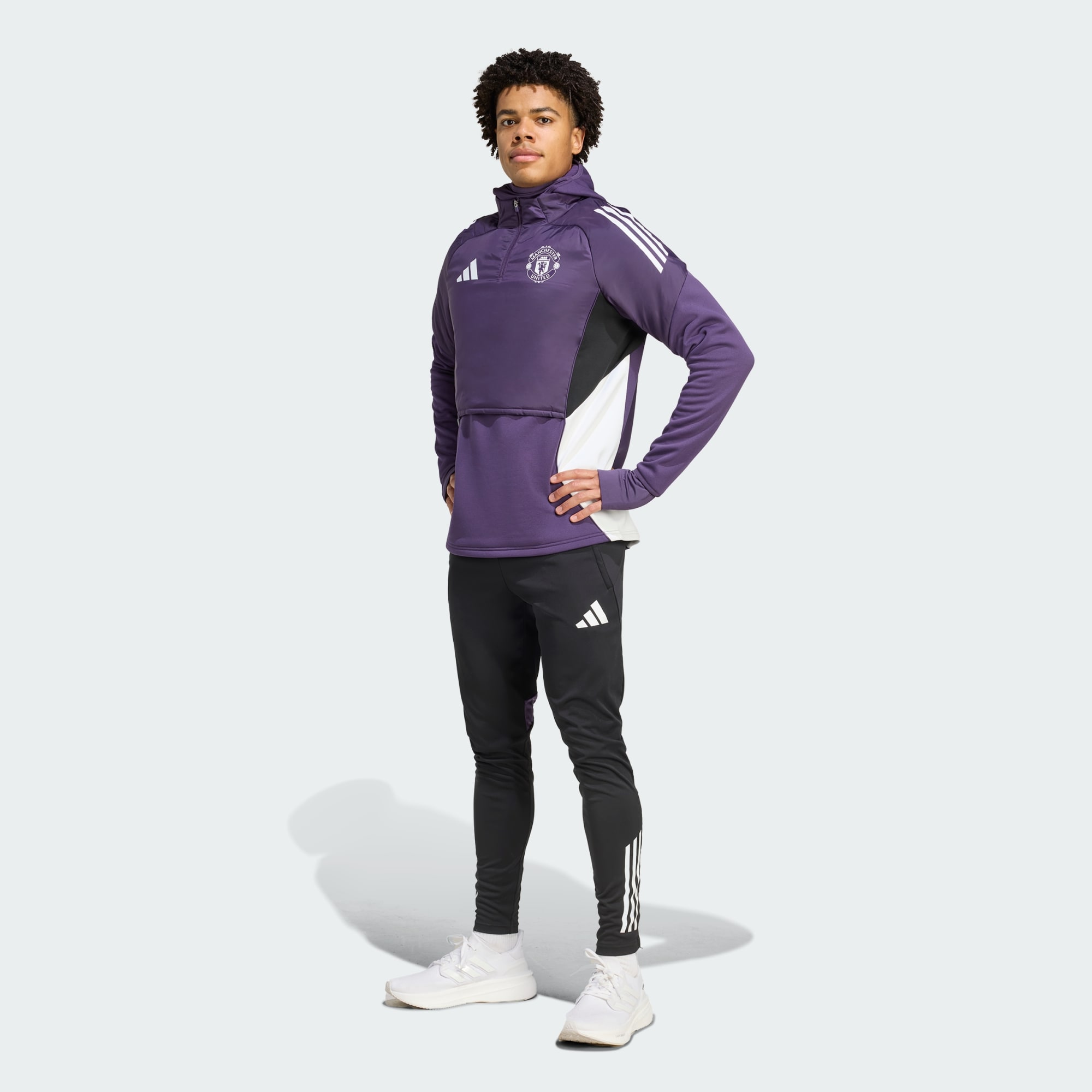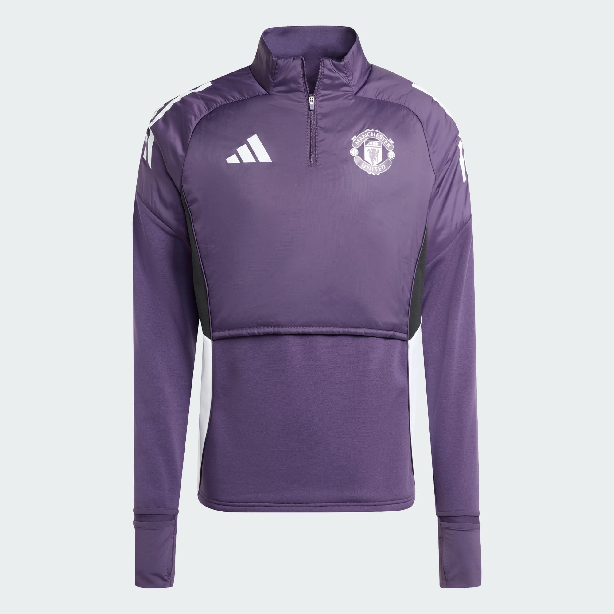 Denne adidas-treningsoverdelen har farger som er inspirert av bortetrøyen til Manchester United, og er en del av drakten laget bruker når de forbereder seg til ligakamper. Den lages for økter i kaldt vær, og kombinerer fremtidsrettede funksjoner – inkludert en sammenleggbar balaklava og håndtrekk som kan brettes tilbake når du ikke trenger dem. Det varmetrykkede klubbmerket fullfører antrekket i fotballstil.