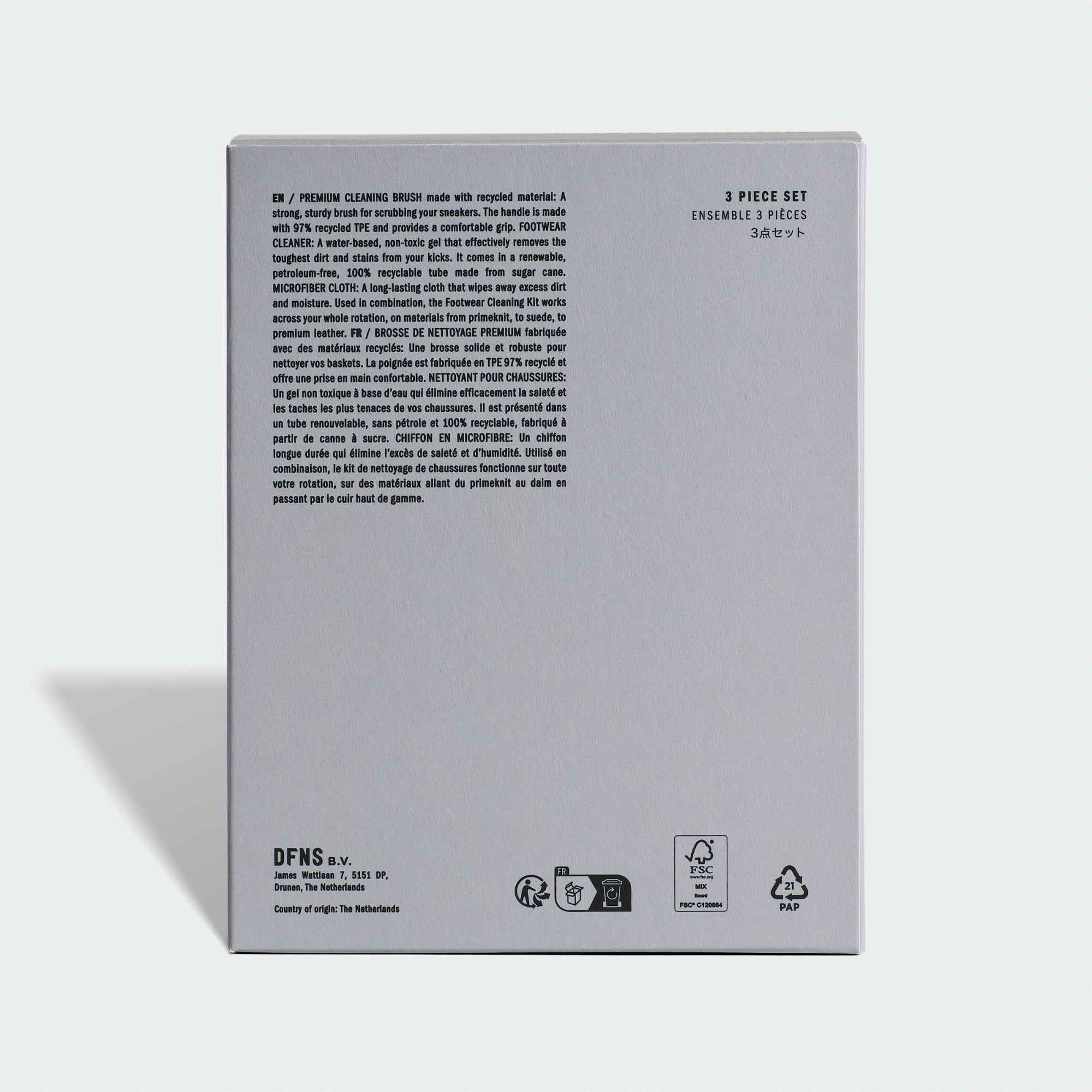 Den komplette rengjøringspakken, for sko som lever lenger. Pakken inneholder en skorens i en 100 % resirkulerbar beholder laget av sukkerrør, en premium rengjøringsbørste laget av resirkulert materiale og en slitesterk mikrofiberklut som tørker bort overflødig smuss og fuktighet. Når verktøyene i rengjøringssettet brukes sammen, fungerer de på tvers av hele rotasjonen din og på alle materialer – fra adidas PRIMEKNIT til semsket materiale og premium skinn.