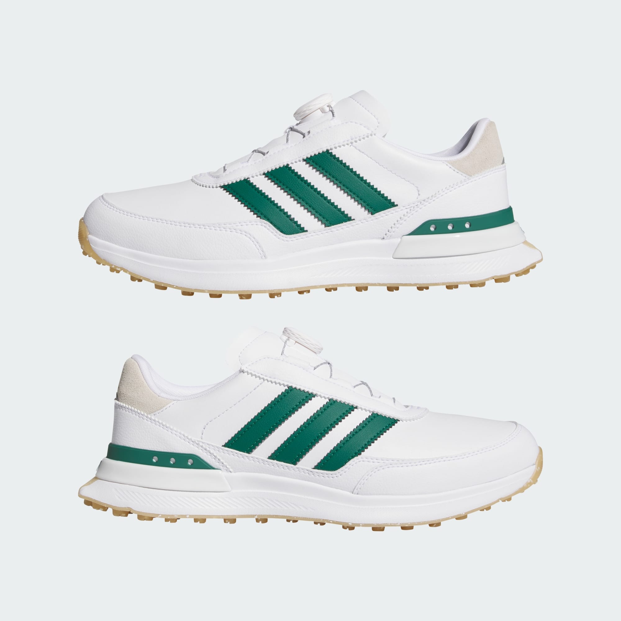 S2G 26 BOA Spikeless-golfskoene designes for å hjelpe deg med å gå sømløst fra gatene til golfbanen, og er en legemliggjøring av allsidighet. Den belagte skinnoverdelen gir et elegant utseende samtidig som den har slitestyrken på maks, enten du tar en spasertur eller perfeksjonerer golfslagene dine. Opplev BOA® Fit System, som leverer raske og enkle justeringer for en egendefinert passform som holder seg sikkert på plass gjennom hele runden. Adiwear-yttersålen av gummi bygges for økt slitestyrke, så disse tåler påkjenningene på banen og utover. Den lette mesteren. adidas Lightstrike-mellomsålen gjenoppfinner følelsen og forventningene til lett demping, samtidig som den beholder den enestående responsiviteten. Hold deg komfortabel fra første tee til siste hull med disse stilige og høytytende golfskoene.