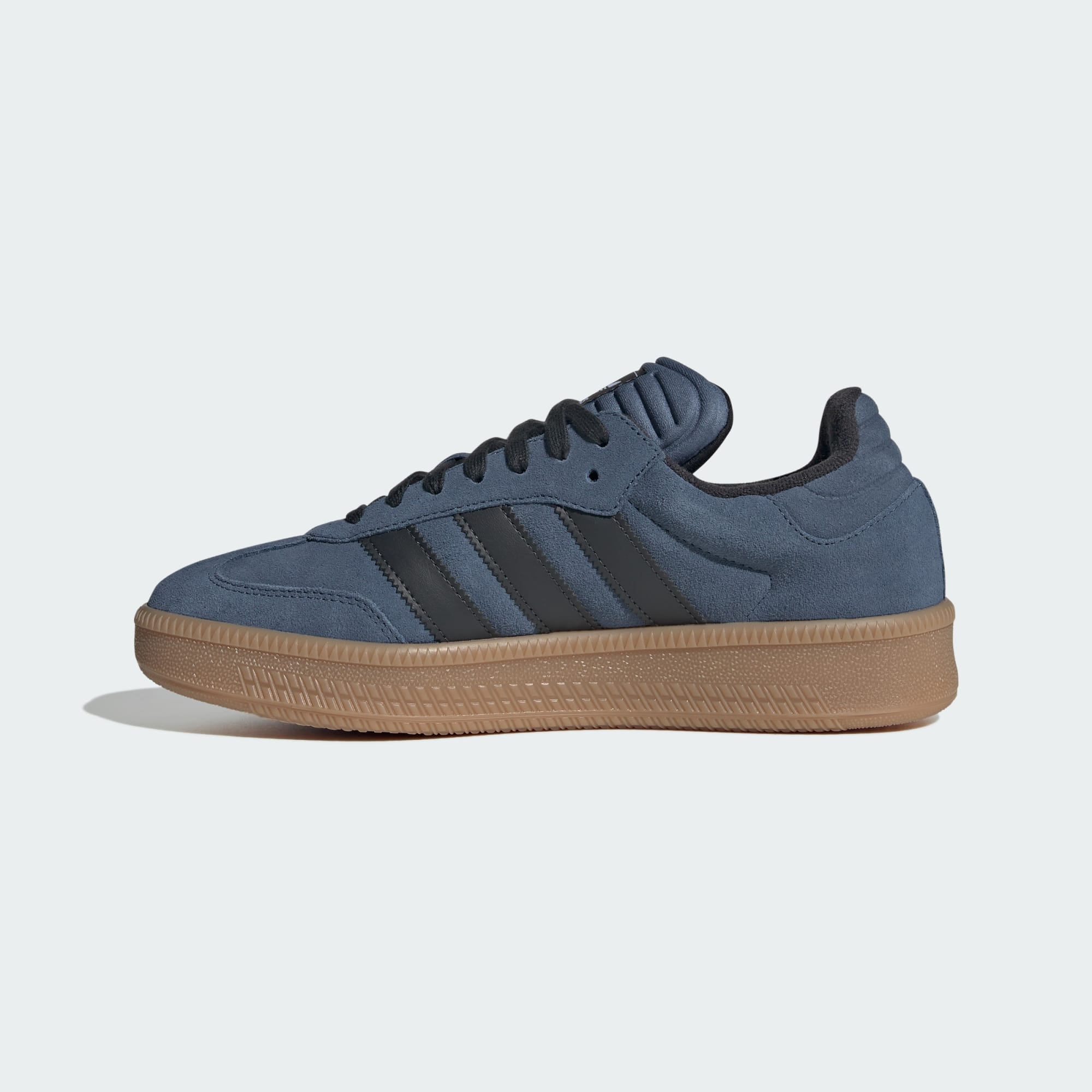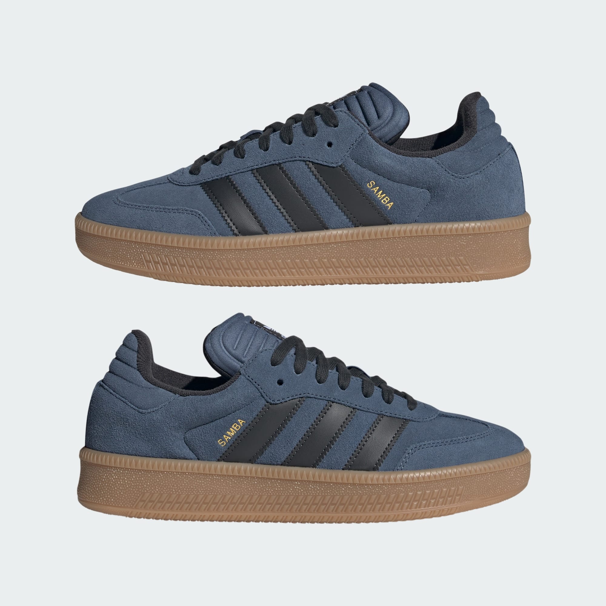 Enda et av ikonene våre får XLG-behandlingen denne sesongen. Disse skoene er overdimensjonerte versjoner av folkekjære Samba, med en mer fyldig pløs og tykkere yttersåle enn originalen. De designes med overdel av semsket skinn, 3-Stripes av syntetisk skinn og mykt fôr av tekstil. Mørke fargeinnslag på fôret, lissene og 3-Stripes skaper et oppfrisket uttrykk som står i kontrast til den lysere basen. Den karakteristiske t-tåen holder stilen forankret i det klassiske.