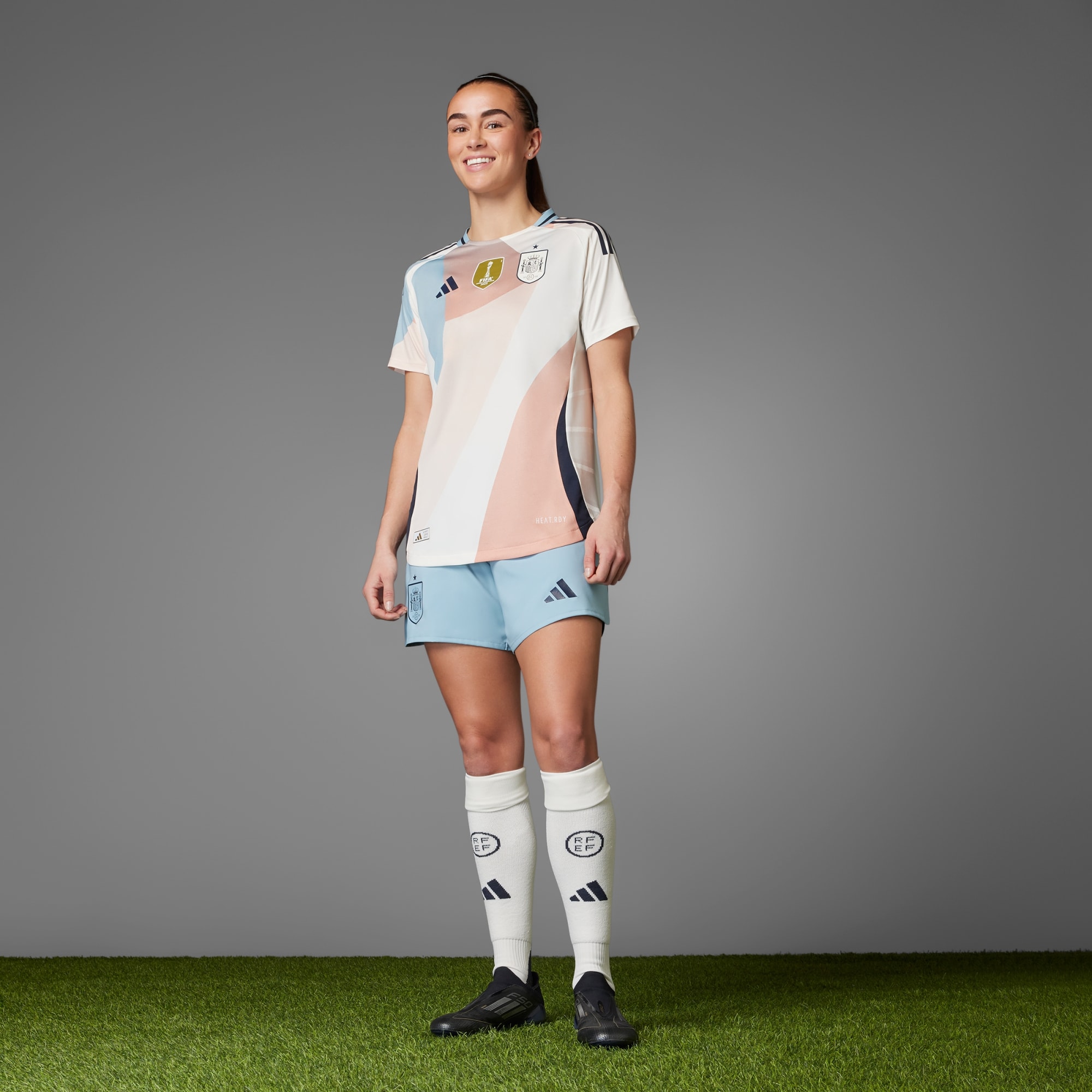 For the beautiful game. The new Spain Away kit brings wearable art to the UEFA Women's EURO 2025™ pitch. Featuring geometric fragments and abstract forms inspired by 20th-century Cubist art, this jersey is designed to fuel creativity on the pitch. Combined with HEAT.RDY technology for ultimate comfort and lightweight materials for quick movement, it's a masterpiece of performance and functionality.