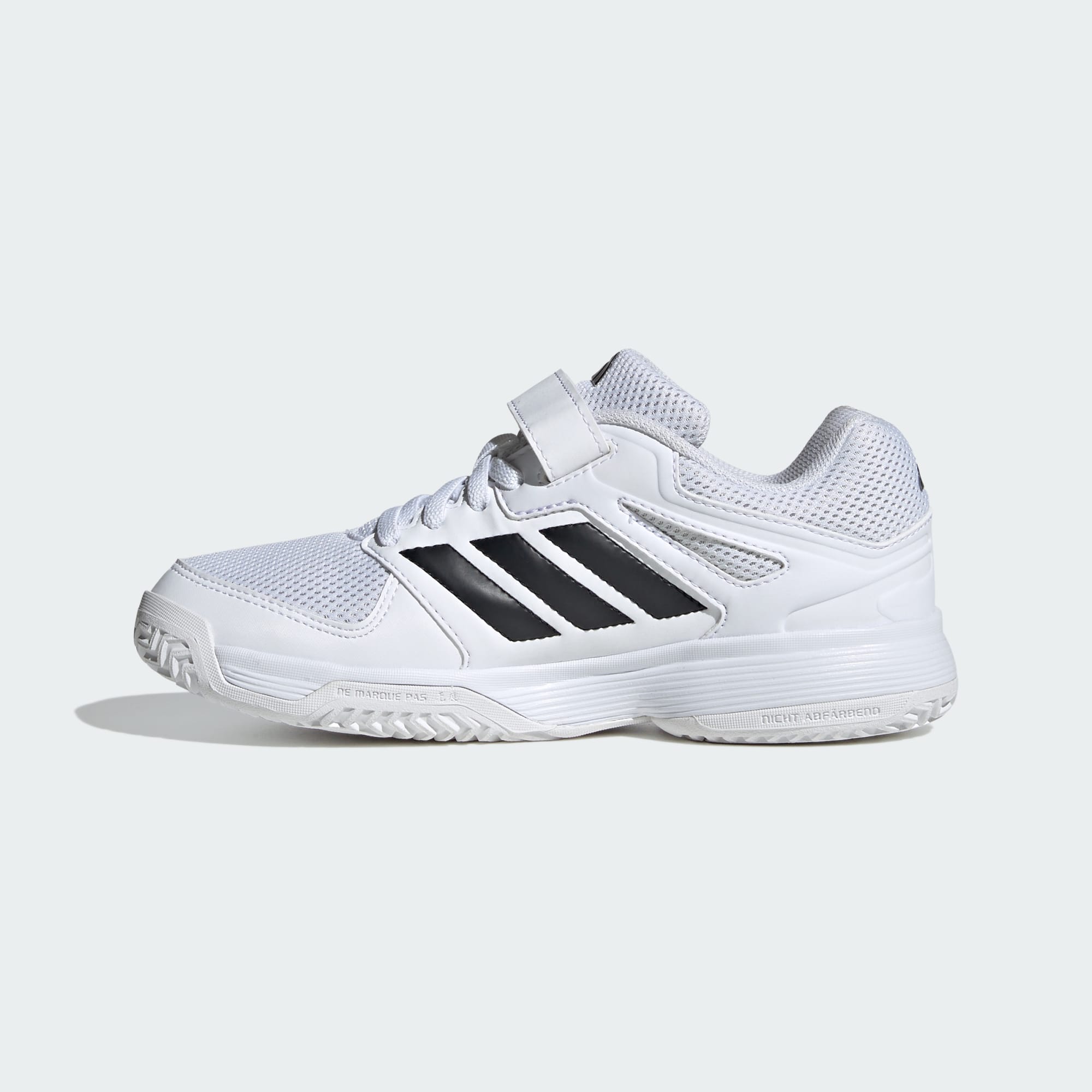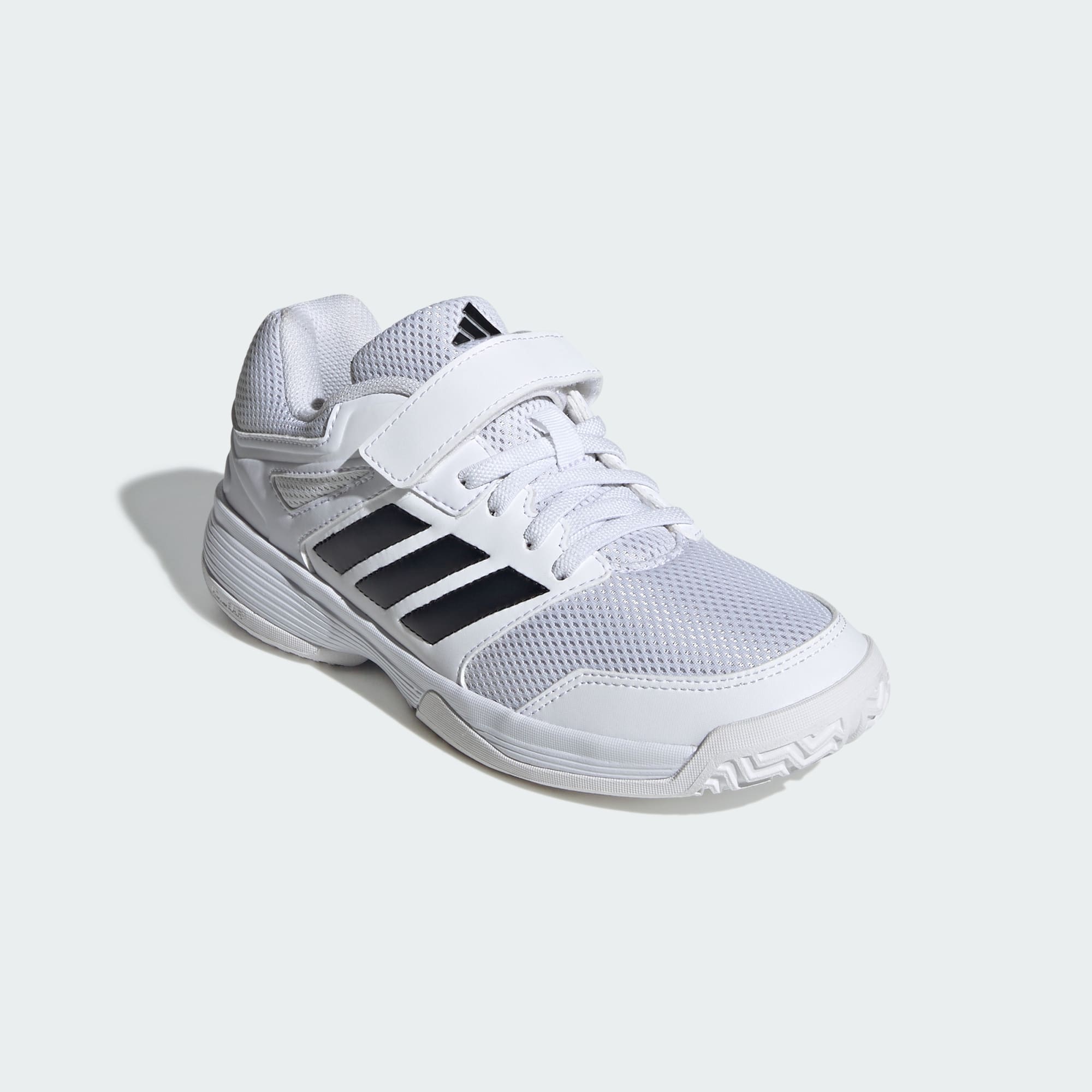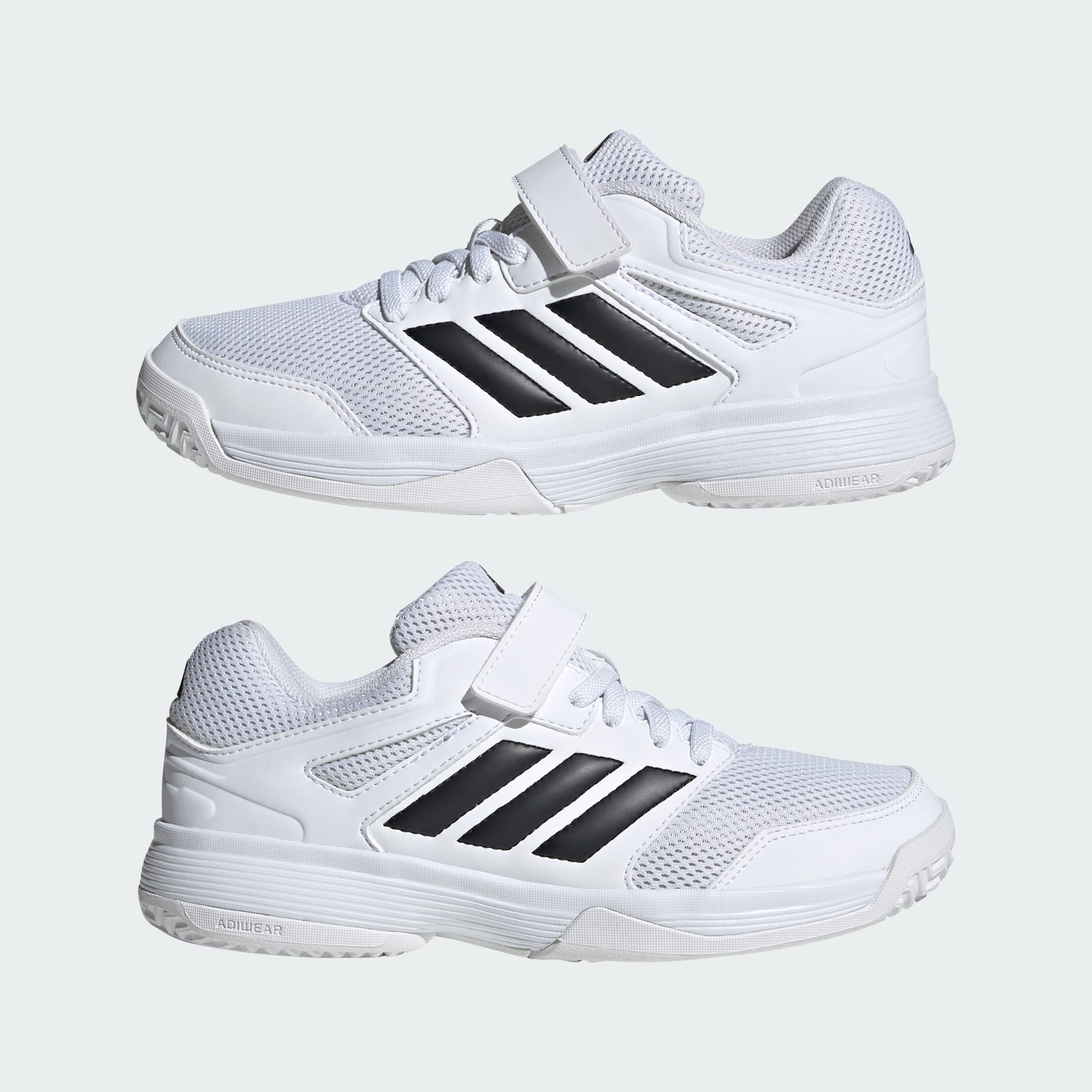 Se dem fly lavt over banen i disse innendørs-barneskoene fra adidas. De kommer med gripesikker yttersåle av gummi, så de holder tritt med selv de raskeste unge spillerne. Ventilerende overdel av mesh sørger for at de holder seg kjølige, og en kombinasjon av stropp og lisser gir trygg og komfortabel passform. Myk EVA demper hopp og sprinter, sittende på en gripesikker Adiwear-yttersåle.