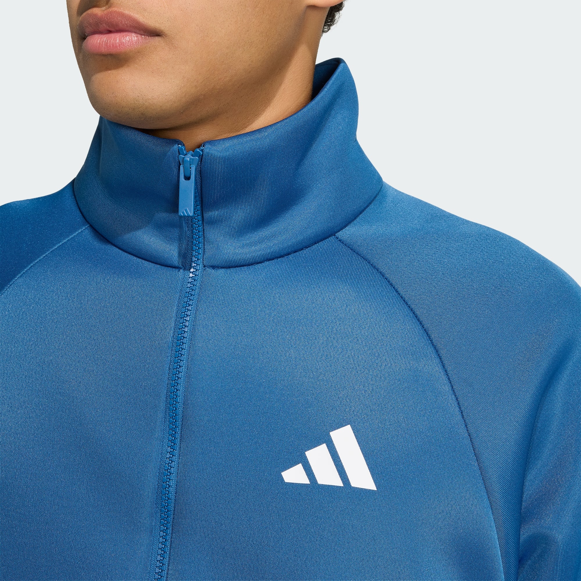 En løs treningsoverdel med hel glidelås, inspirert av sportens energi og spenning.