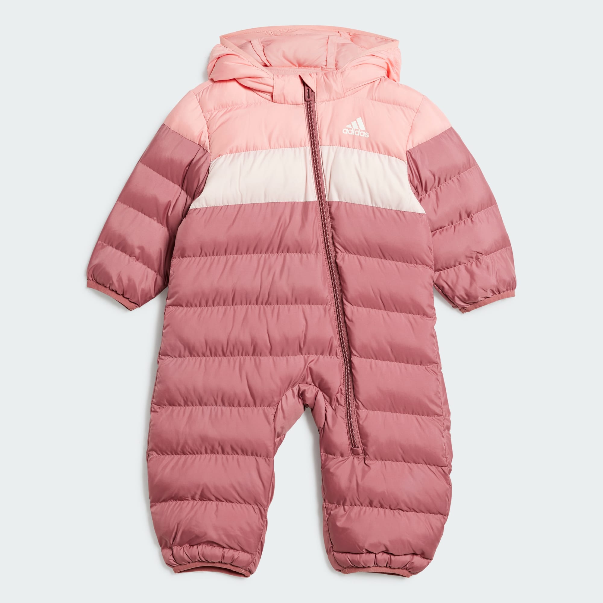 Don't let winter weather slow down the adventure for your little explorer. This adidas snowsuit keeps infants cosy and bundled while they discover the world. Perfect for toddling through snowy streets or playing with snow in the backyard, puffy synthetic down offers warmth without the bulk. Reflective details increase visibility at dusk and a detachable hood provides extra coverage when the wind blows cold. No matter what winter brings, this snowsuit makes sure your little one is ready for some fun.This product is made with 100% recycled materials. By reusing materials that have already been created, we help to reduce waste and our reliance on finite resources and reduce the footprint of the products we make.