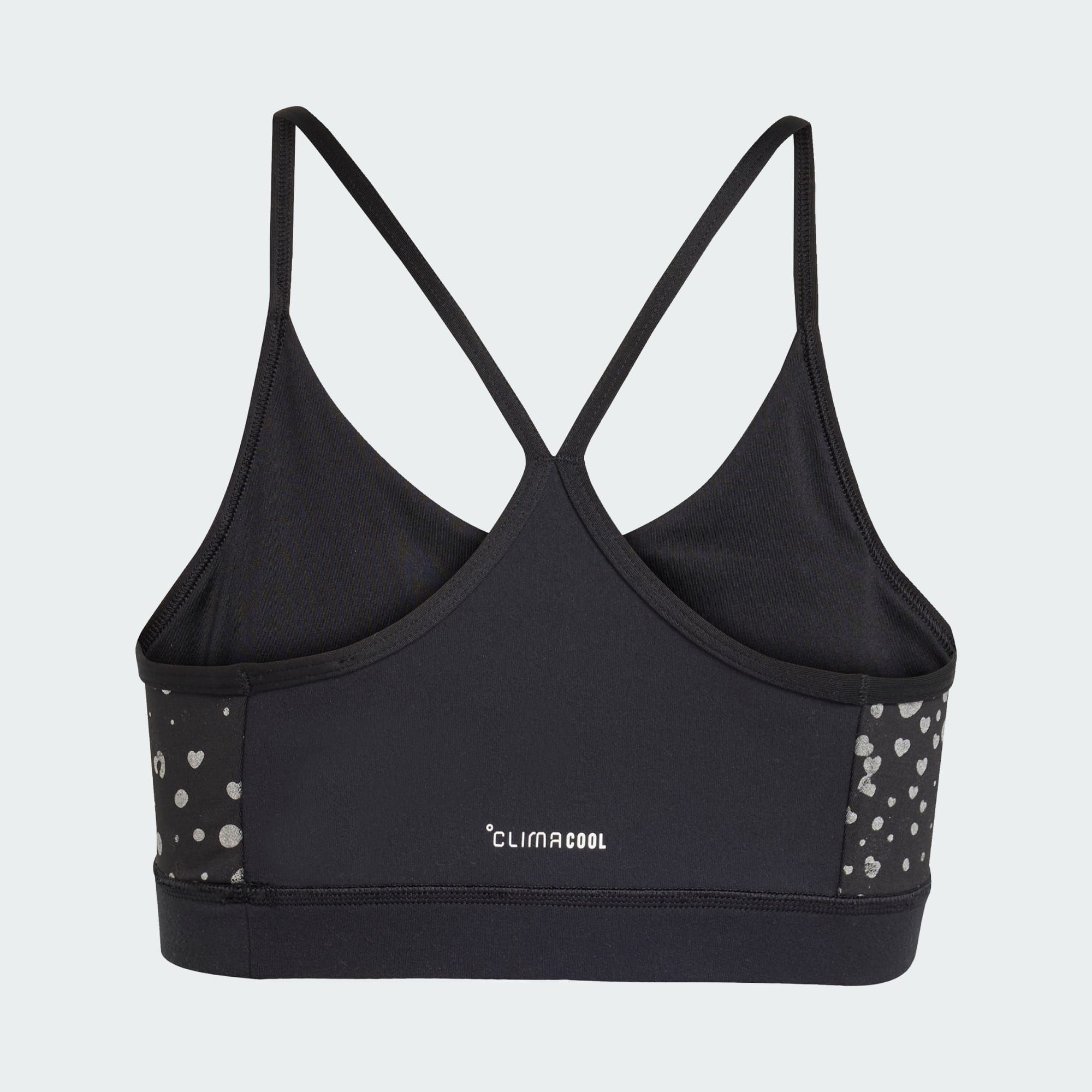 Express your inner athlete in this adidas Essentials Glam Print Bra for juniors. The medium support design ensures you can move freely during your workout. The soft, breathable fabric wicks moisture to keep you cool and dry even during intense training, while the full lining keeps it comfortable throughout. Thin, cross-back straps keep the bra in place without getting in your way. Pair it with your favourite leggings or shorts for the perfect gym look. CLIMACOOL wicks and disperses sweat for cool, dry and distraction-free performance. CLIMACOOL helps you manage sweat with materials that wick and manage sweat quickly. Its fast-dry fibres give you a fresh-skin feel.