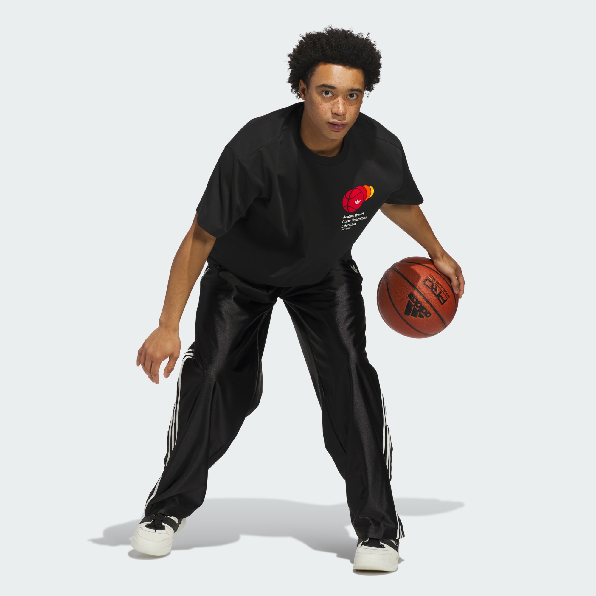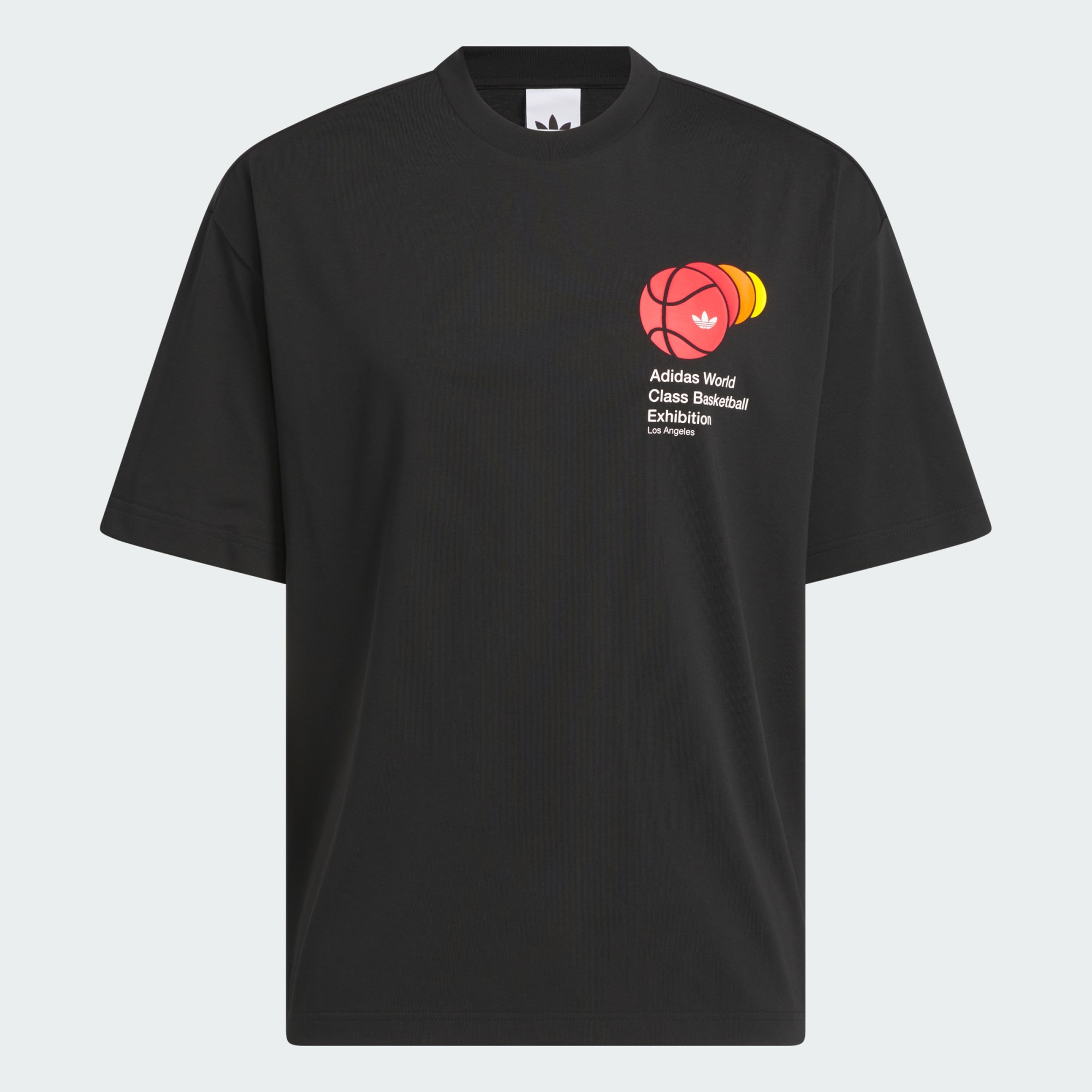 En løs t-skjorte med rund hals og basketballgrafikk.