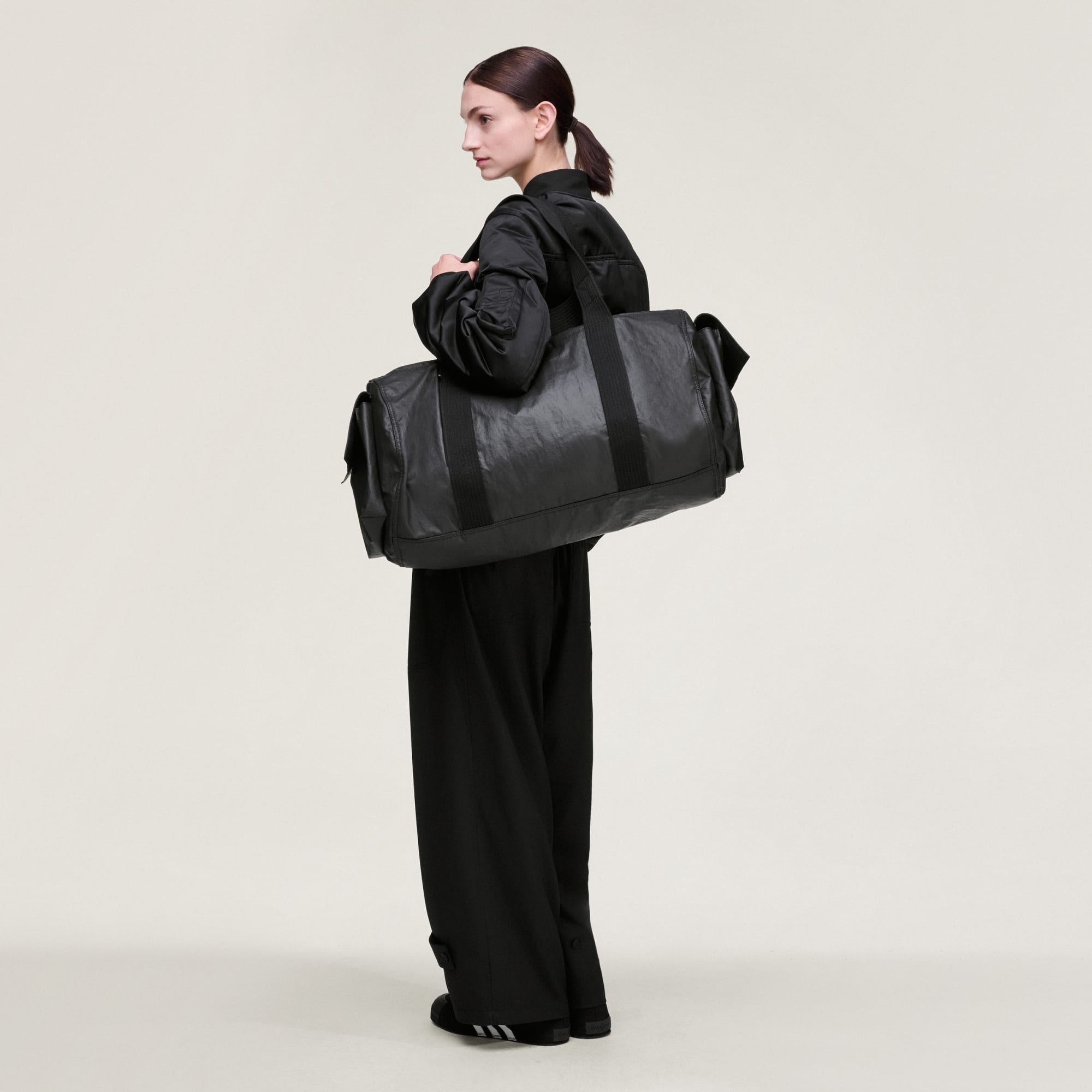 Vi presenterer Y-3 Dufflebagen, en dristig nytolkning av en klassisk silhuett som henter inspirasjon fra brukervennlig arbeidsklærdesign. Denne bagen lages av vannavstøtende rynket nylonstoff, med slitestyrke sammen med den særegne teksturen. Den har to asymmetriske cargo-lommer med magnetiske klaffer for rask tilgang til oppbevaringsplassen din, mens en skjult glidelåslomme på utsiden holder det viktigste diskret på plass. Det romslige hovedrommet åpnes med glidelås, og avslører et helfôret interiør utstyrt med doble mesh-lommer og en glidelåslomme med D-ring, utmerket for organisering av de mindre gjenstandene. Robuste, vevede håndtak gjør den enkel å bære med seg. Silikontrykket Y-3- og Yohji Yamamoto-logo serverer en ren og taktil branding som fullfører uttrykket.